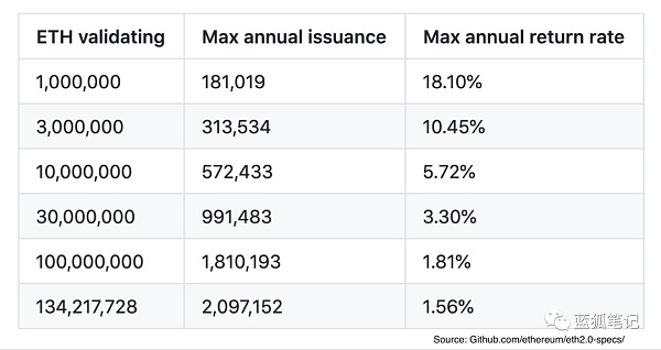 (藍狐筆記:藍狐筆記預計早期質押收益為17%-20%的時間不會太長,這個收益會導致很多閑置資金的進入,只要收益超過5%,質押的動力已很強大了。不過有一種情況會阻礙其質押,就是ETH2代幣是否可以轉移或交易。不過其流動性也可以通過其他方式來解決)