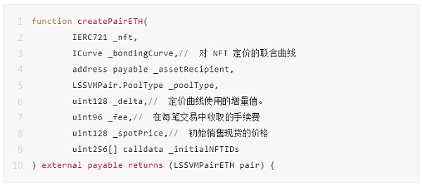 創建流動性池使用的是LSSVMPairFactory.sol 程序中的createPairETH 函數方法,非常夸張的是,對比uniswap他可以設置的核心參數很多,執行創建會采用EIP-1167 的標準,也部署一個mini proxy合約,可以說即有獨立合約的安全性(資產存于新部署的合約地址),LP有超級管理員權限,對定價函數,增量閾值,初始費用,全局手續費均可以控制。