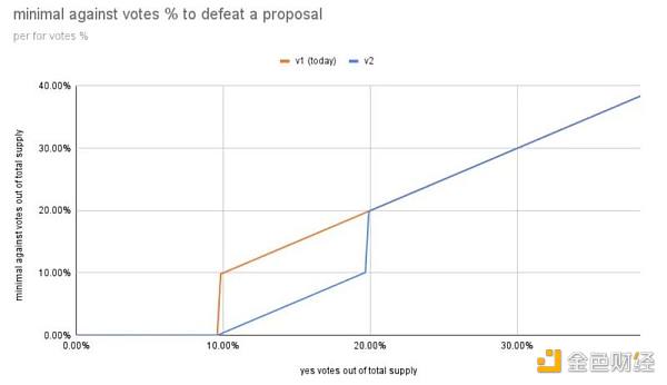 增加最小仲裁基點的值會增加圖中間的空間,盡管提案在v1中成功,但在v2中會被否決,這使得在最大仲裁基點(v1和v2都由簡單的多票制決定)之前否決提案會變得容易得多。減少最小仲裁基點會產生這種很酷的新圖形形狀,在v1 仲裁(10%)以下,實際上很難在v2中否決提案。
