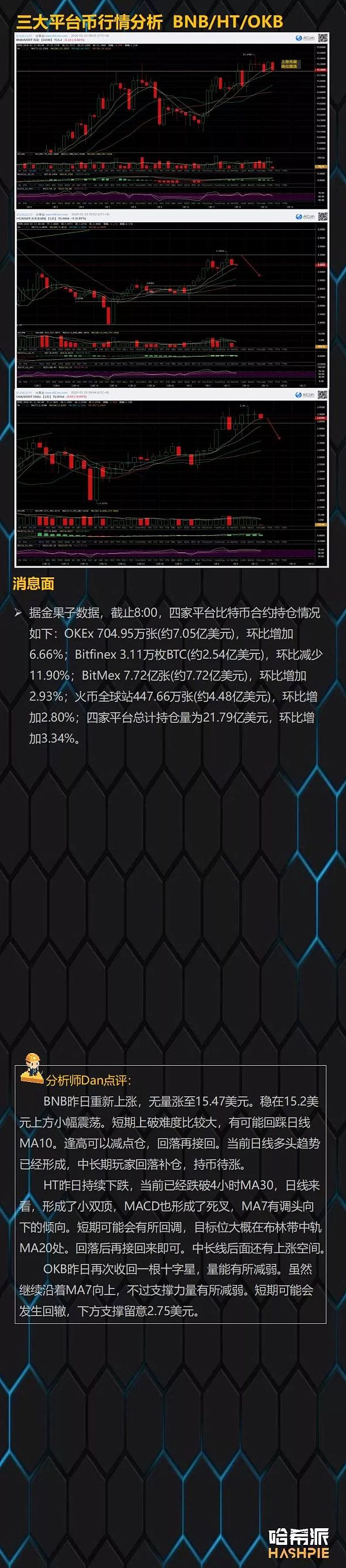 分析 | 大盤昨晚直線拉升后續怎么走?:金色財經分析師認為近期各主流幣在前日下破低點得到周線級別的重要支撐,昨日在平臺幣的帶動下開啟反彈大漲,日線反包形成,短期看漲,預計近日將逐步測試上方壓力位,若能突破大跌后的K線,則宣告調整結束,開啟新一輪趨勢行情,建議拿好手中中長線籌碼,短線可以適當低吸入場。BTC支撐3750/3700,壓力3890/3950;EOS支撐3.5/3.35,壓力3.85/4.35;ETH支撐133/129,壓力140/146;HT在1.62-1.42區間,其他品種同步BTC操作。