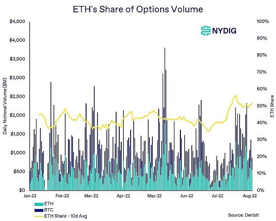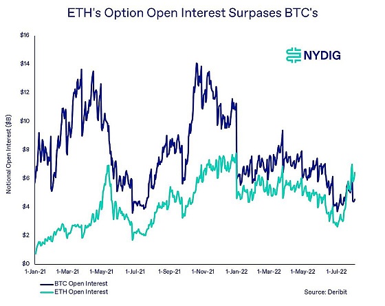 7 月 14 日以太坊開發者電話會議公布了更準確的合并時間線,這引發了以太坊現貨價格的反彈。在現貨價格上漲的同時,期權交易活動也有所增加,尤其是與 BTC 相關的期權交易,這表明交易員們開始對這一重大事件有所預期。ETH 期權交易量通常約占 BTC 日均名義交易量(以美元計)的 60%,開始超過BTC。交易活動的增加導致未平倉合約的增加,未平倉合約的價值也超過了 7 月 23 日的 BTC。