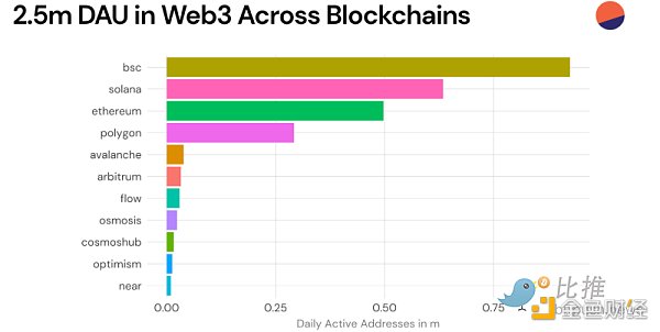 1、web3 上每天有 250 萬個錢包處于活躍狀態,Binance、Solana、Polygon 和 Ethereum 錢包占這些每日活躍用戶的 80% 以上。