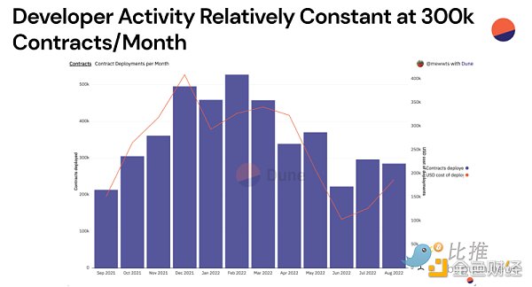 解讀:在開發層面上,每月 30 萬個智能合約可能還包括重復造輪子和仿盤等行為。筆者建議更多的看代碼質量和認可度數據(比如 Github 上的點贊和收藏數據等)。