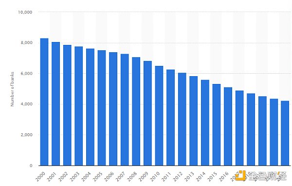 美國的銀行數量自 1921 年達到 30,456 家銀行的高峰后一直在下降。下面我們可以看到過去 21 年的變化率,銀行的數量已經減少了一半,達到 4,236 家。而如果我們一直往前追溯到 1984 年,美國的銀行數量已經減少了 70%. 最近新銀行的加速減少表明自大衰退以來缺乏盈利能力,主要是受低利率的驅動,凈息差崩潰了。危機后的新法規也推高了行政設置成本,創造了更多的門檻障礙。
