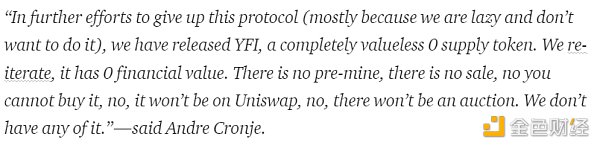 “為了放棄這個協議(主要是因為我們很懶,不想繼續做了),我們做了進一步努力,發行了YFI,這是一個完全沒有價值的0供應代幣。我們重申,它不具財務價值。沒有預先挖礦,沒有銷售,你買不到它,不會在Uniswap上交易,也不會有拍賣。我們什么都沒有。”——YFI創始人Andre Cronje。