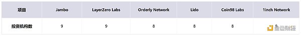 這 30 家機構總計進行了 2543 次投資,投向了 1317 個項目,其中 637 個項目被兩個及兩個以上機構投資。出現在這個極小的樣本中頻率最高的被投項目是 Jambo 和?LayerZero Labs,都拿到了 30 家機構中的 9 家的投資,而 Orderly Network、Lido、Coin98 Labs 和 1inch Network 都獲得了其中 8 家機構投資。