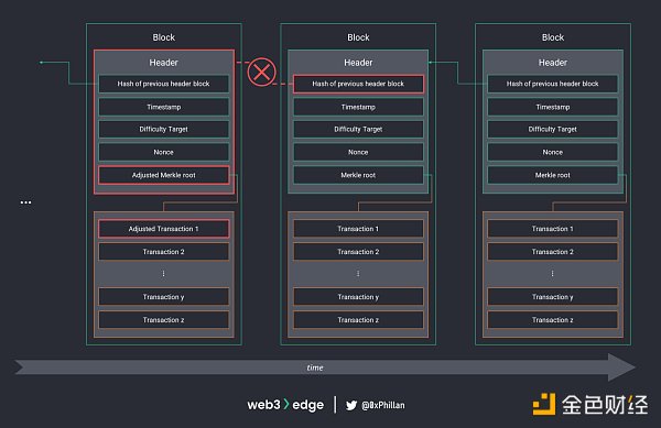 在比特幣網絡中,存儲在區塊頭中的 Merkle root 是該區塊中包含的所有交易的遞歸哈希輸出。這意味著,如果任何交易被調整,Merkle root 也將改變,這也將改變整個區塊頭的哈希輸出。這將再次導致區塊的無效化。