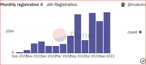 截至上個月底,ENS 總域名數量達到 217 萬個,如今 9 月份尚未結束,注冊量便超越 7 月份達到 38 萬個,再創歷史新高,這也可以視為觀察 Web3 用戶及活躍體量的絕佳入口。