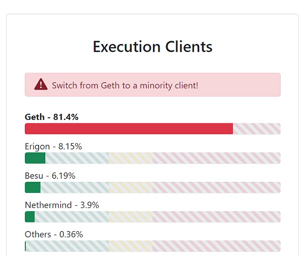 客戶端多樣性的運行仍然是一個重大挑戰。雖然 Erigon 和 Nethermind 等客戶端一直在改進,但 Geth 仍然是大多數節點所依賴的客戶端。如果 Geth 出現嚴重錯誤,所有將其用于執行層的驗證者都將面臨對其權益的懲罰。