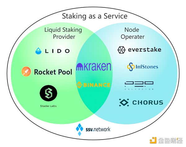 這種供需關系下,催生了一些機構給普通用戶提供代理質押的服務,即 Staking as a Service. 主要分為節點運營商(Node Operator)和流動性質押服務商(Liquid Staking Provider),前者運行節點,維護共識;后者提供質押衍生品,解決 PoS 質押流動性問題。