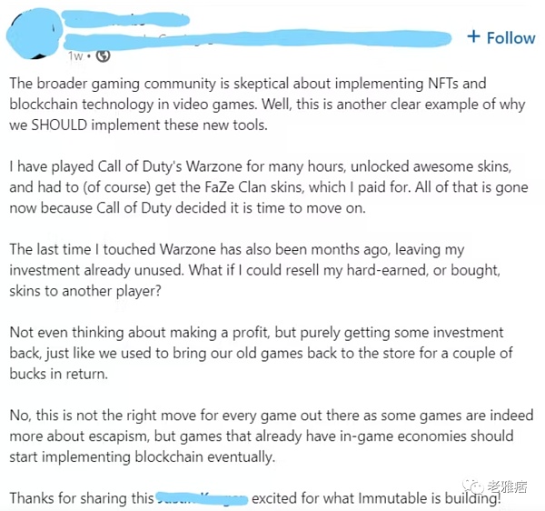 一位在“Web3”工作的專業人士同時也是一名游戲玩家的 LinkedIn 帖子截圖