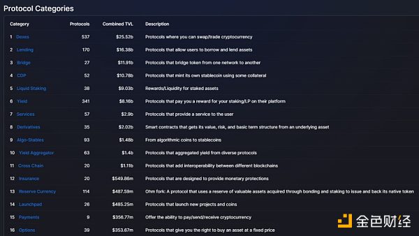 DeFi 各賽道協議數量和 TVL,來源:DeFiLlama