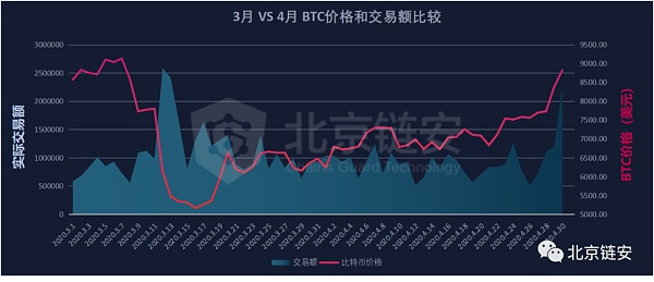 2020年4月,比特幣鏈上交易額為27904397.58BTC,相較于2020年3月的33785430.55BTC,下降了17.41%。盡管4月少了一個交易日,但是整體依然可以看出4月鏈上交易額的下降,但是我們也可以看出幣價波動對鏈上交易額的影響,逐日同比來看,3月的交易額主要由“3.12暴跌”后產生,而4月伴隨月末的比特幣價格大漲,鏈上交易額也隨之拉升。