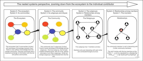 就像身體是由身體部位組成、身體部位又由生物分子組成的細胞組成一樣,社區也是如此。身體是更大的社會和生態系統的一部分,社區也是如此。根據嵌套系統模型(Holling 2004),社區存在于嵌套系統的層級結構中:關系中的個體、子群體、社區、社會、生物圈中等。