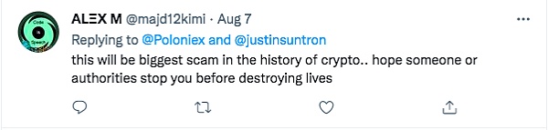 最先發聲且一步到位的上線了硬分叉代幣ETHW(ETH 1)當屬炒作者孫宇晨,在8月7日,Poloniex連發多條推特,聲稱自己是第一個支持分叉的交易所,并上架了ETHS和ETHW兩個代幣,并與孫宇晨頻繁互動。對此,V神評價到,ETHW的硬分叉支持者正在被“擁有交易所的人試圖快速賺錢”推動。而我們從推特下的評論中也可以感受到不買賬用戶居多,痛斥這是一場騙局。