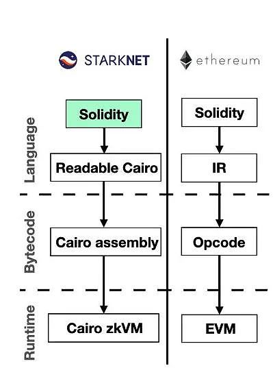然而,Nethermind團隊(與StarkWare合作)已經創建了Warp轉譯器,它能夠將任意的Solidity代碼轉換為Cairo VM字節碼。Warp的目標是將普通的Solidity合約移植到StarkNet上——這會實現許多以太坊開發者在“EVM兼容性”方面的主要目標。然而,在實踐中,Warp 不支持一些 Solidity 功能,包括低級調用。