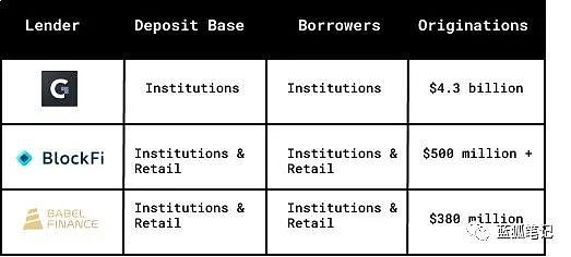 加密行業增長最快的部分之一是信貸市場,尤其是在機構和散戶貸款人的推動下。這些公司通過向存款人保證利率來聚集資本,然后將其借給機構投資者或散戶。其中最大的公司包括Genesis Capital、BlockFi以及Babel Finance。這些貸方之間的主要區別在于,有哪些類型的投資者構成了其存款基礎,是機構還是散戶。