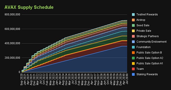 Avalanche (AVAX) 的初始代幣發布日期為 2020 年 9 月 21 日。該代幣的最大供應量上限為 720,000,000。預計到 2030 年 7 月,AVAX 的供應將完全歸屬。