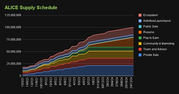 ALICE 的初始代幣發布日期為 2021 年 3 月 15 日。該代幣的最大供應量上限為 100,000,000。