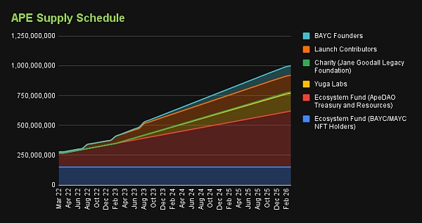 Apecoin (APE) 的初始代幣發布日期為 2022 年 3 月。該代幣的最大供應量上限為 1,000,000,000。Apecoin(APE)的供應預計將在 2026 年 3 月完全歸屬。