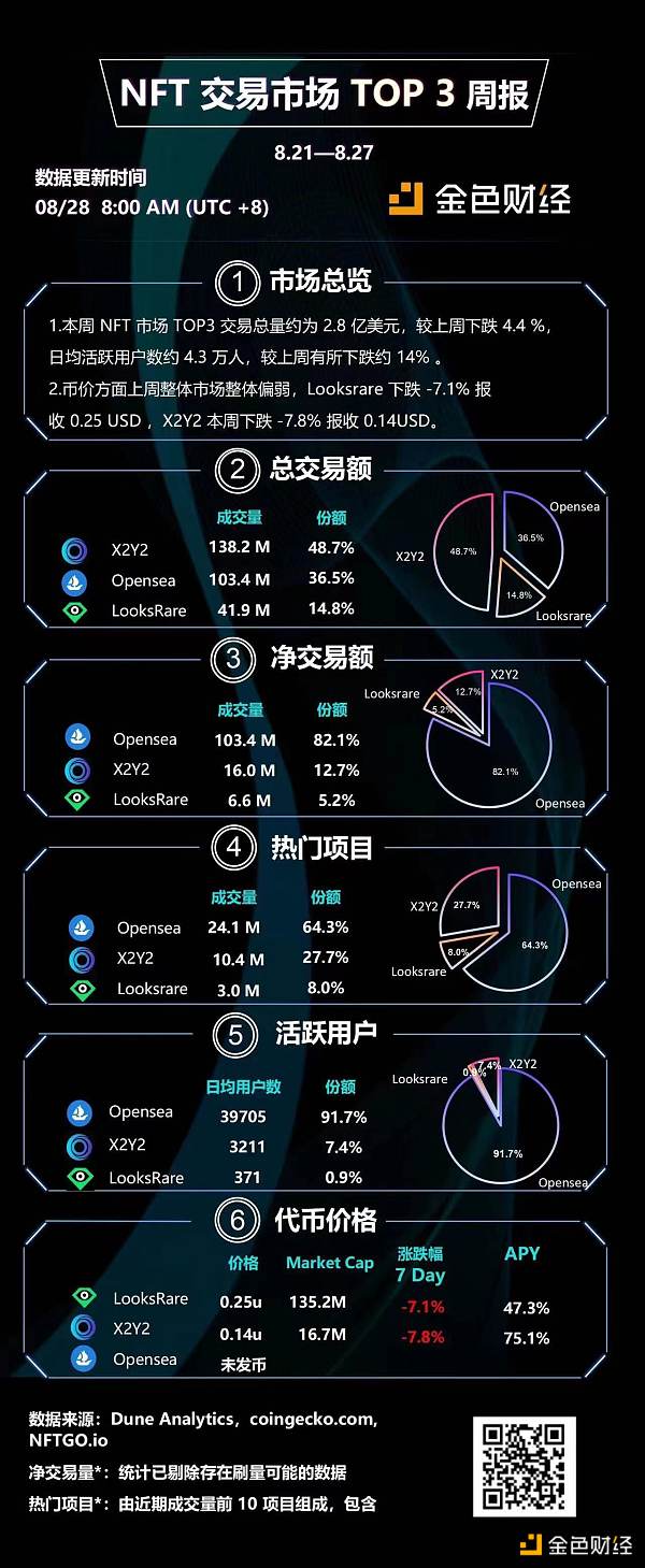 1、上周 NFT 市場成交量有所回落,較上周下降約 4.4%;其中 X2Y2 周成交額持續位居榜首,份額占比 48.7%。