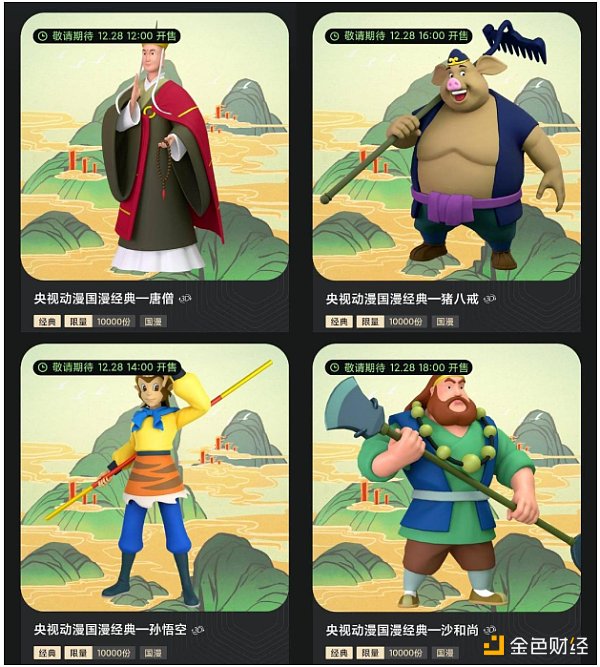 四款數字藏品形象是西游記里取經的四人,唐僧、孫悟空、豬八戒和沙和尚。公開發行數量10000份/款。創作者是央視動漫集團有限公司,發行方也是央視動漫集團有限公司。
