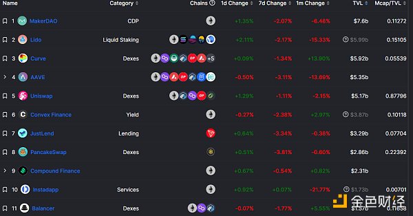 DeFi項目鎖定資產前十排名及鎖倉量 數據來源:defillama