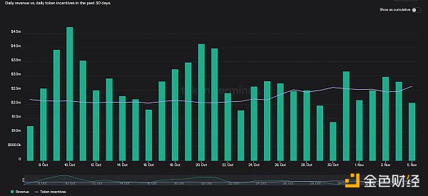 代幣的被動持有者呢?我們認為被動持有者應該將“實際收益率”視為通貨膨脹率和費用燃燒率之間的差異。費用銷毀基本上是支付給被動持有者的。這是過去 30 天以太坊的情況。綠色 = 費用銷毀(代幣終端記為“收入”),紫色 = 代幣激勵(支付給驗證者的區塊獎勵/協議膨脹)。