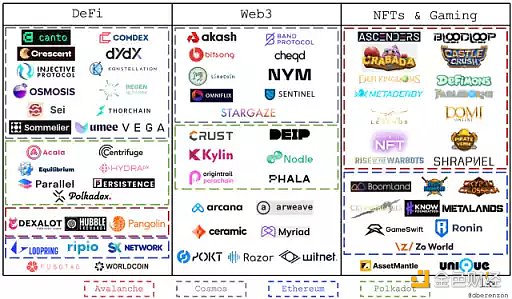 此外,雖然 AppChains 的啟動和互操作問題在歷來是困難的,但在過去幾年中,開發人員和用戶都在加速接受 AppChains。Axie 于 2021 年初推出了他們的以太坊側鏈 Ronin,DeFi Kingdoms 宣布于 2021 年底從 Harmony 轉移到 Avalanche 子網,Apecoin 社區約 46% 的成員仍支持構建 ApeChain,dYdX 宣布他們的 V4 版本協議將建立在使用 Cosmos SDK 打造的 L1 上。今天,有無數的應用程序構建在 AppChains 上。