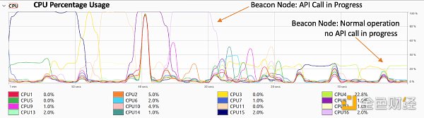 為了進一步顯示正在運行的節點,我們為共識層調用一個端點來返回所有驗證節點的集合(例如,/eth/v1/beacon/states/{state_id}/validators),這是在編寫本文時超過400,000個驗證節點的結果。該查詢的運行時間為幾分鐘,如下所示,在請求處理期間,CPU的使用率明顯增加,然后在請求得到回復后又回落到“正常”狀態。