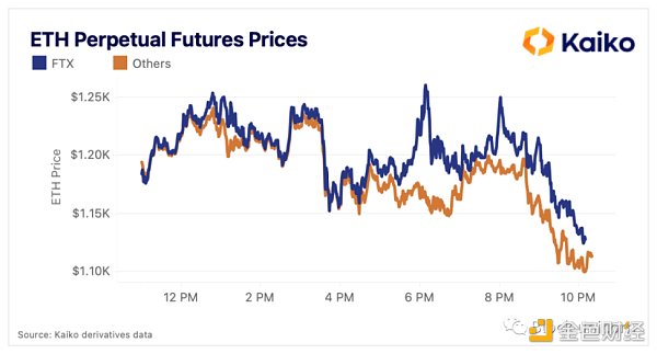 FTX 現在是在煉獄,交易所的所有資金實際上都變成了大富翁的錢或合法債權,這取決于你的時間跨度。做市商和投資用戶都被困在交易所里,與其他市場隔絕,只能發展自己的生物圈,這一點最簡單的體現是 FTX 上的 ETH 永續合約的價格,它在 11 月 9 日開始出現與其他交易所的 ETH 價格出現偏離。