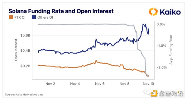 接著說 Alameda,該公司持有大量的 SOL 和 Solana 生態系統代幣。FTX 也曾是該項目早期的支持者,SBF 也經常對該網絡給予高度評價。SOL 的價格在崩盤中暴跌,FTX 上的未平倉合約趨向于 0。其他交易所的未平倉合約激增,再加上融資率猛烈下行,表明有大量做空。