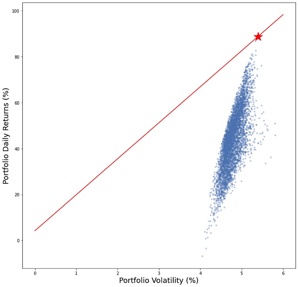 確定最佳風險投資組合:這將是 N 種風險資產的組合,使夏普比率最大化(更多內容見下文)。