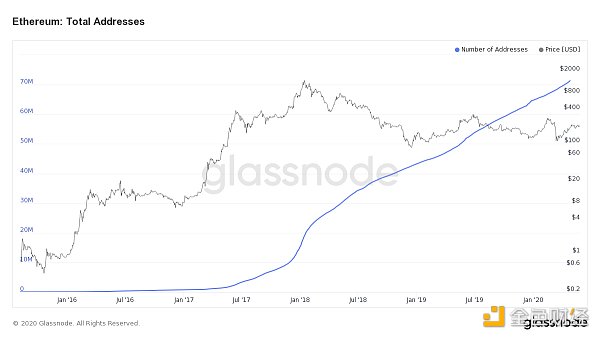 根據Glassnode的數據,現在有4000萬個以太坊地址持有ETH,由于其價格在2018年第一周達到歷史新高,自此這個數字增長了350%。