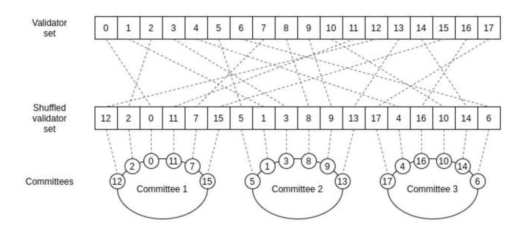 分片系統必須開發一種機制來信任網絡不會從外部分片中逆轉這些交易。迄今為止,可能最好的答案是確保分片內的驗證者數量高于某個最小閾值,這樣不誠實的驗證者壓倒單個分片的幾率就會很低。最常見的辦法是構建一定程度上的無偏隨機性,依靠數學的方式,將攻擊者的成功概率降到最低。比如以太坊,以太坊的解決辦法是隨機從所有驗證者中選出某個分片的驗證者,并且每 6.4 分鐘(一個 epoch的長度)更換一次驗證者。