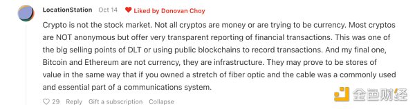 加密貨幣不是股票市場。不是所有的加密貨幣都是貨幣或想發展成貨幣。大多數的加密貨幣是非匿名的,且提供非常透明的金融交易報告。這是 DLT (分布式賬本)或使用公共區塊鏈記錄交易的一大賣點。還有,比特幣和以太坊不是貨幣,它們是基礎設施(infrastructure)。它們被證明是價值存儲,就像電纜是通信系統常用并重要的一部分,而你擁有了一段光纖。