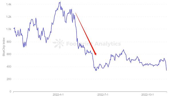 如上圖的藍籌股指數是通過跟蹤 20 多個知名的、財務穩定的公開交易非金融公司的市值份額指數。它參考標準普爾 500 指數的算法,計算每天有 [X] 個藍籌 NFT 的所有值(美元)之和,然后在除以 [X] 個 NFT 算出。