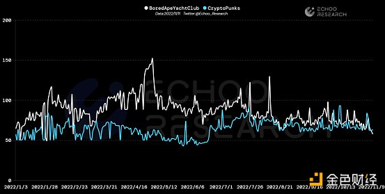 從價格壓力測試上來看,Bored Ape Yacht Club在觸及歷史價格相對低點時,反彈幅度要大于CryptoPunks,多次反彈幅度達到50%以上,而CryptoPunks在本年多次觸及價格最低點,并有跌破的情況。在持有人分布度上,Bored Ape Yacht Club為人均1.56個, CryptoPunks人均持有 2.78 個,Bored Ape Yacht Club的分布籌碼較CryptoPunks更加平均。