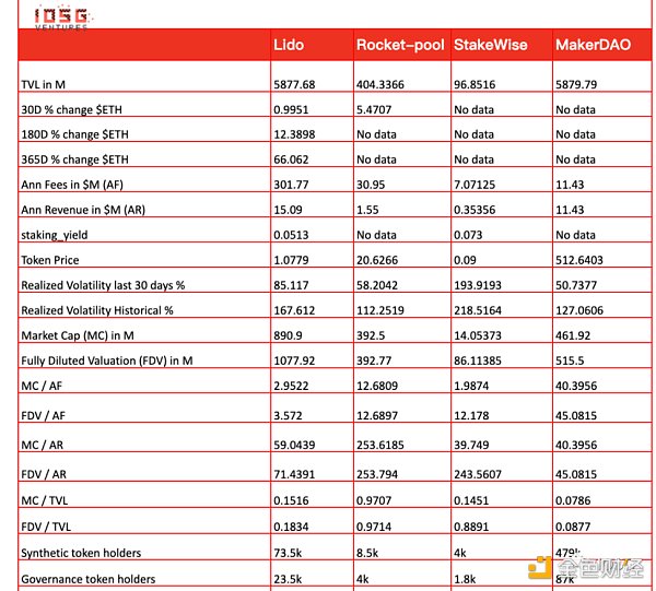 定量比較:為了有一個更成熟的競爭對手作為基準,我們還將 MakerDAO 添加到表中,因為本質上 LSD 與合成資產最相似,其中 stETH 是一種合成資產。如果有一天 Lido 決定支持鑄造由質押的 ETH 支持的合成穩定幣,我不會感到驚訝。