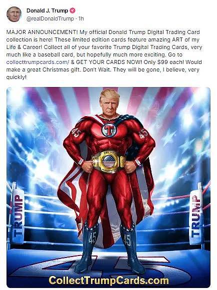 12 月 15 日,特朗普的 NFT 正式發售,45000 個,以每個 99 美元的價格在 18 個小時內售罄,持有該 NFT 將獲得抽獎的機會,包括簽名紀念品、與特朗普打高爾夫、參與特朗普舉行的晚宴、特朗普會面的機會等。