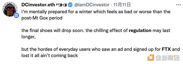 我已經做好了迎接冬天的心理準備,這個冬天的感覺和 Mt Gox 后時期一樣糟糕或更糟。最后的鞋子很快就會落地。 監管的寒蟬效應可能會持續更長時間,但是那些看到廣告并注冊 FTX 并最后失去一切的日常用戶群不會回來了。