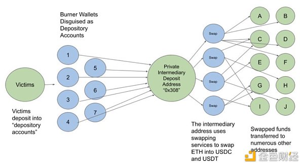 在上文提到的案例中,一旦受害者訪問了山寨新加坡國際貨幣交易所網站就會得到以太坊區塊鏈存款地址。當受害者將資金轉移到這些錢包中后,欺詐者即可將其資金轉移至中間人存款地址。