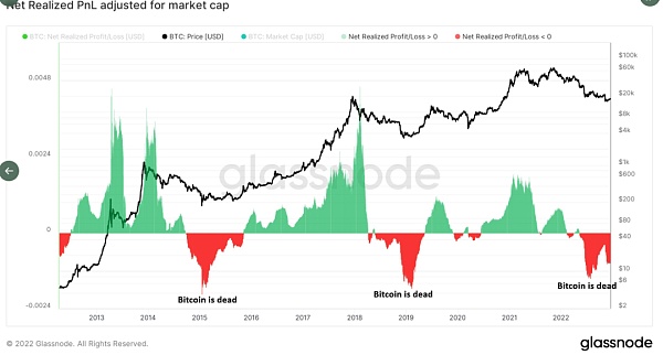 根據Glassnode的數據:加密期貨交易量低迷,與BTC 和 ETH 市場目前的交易量相似,每天在 95 億美元 到 105 億美元之間, 這顯示了流動性收緊、廣泛去杠桿化以及該領域許多貸款和交易部門受損的巨大影響。2020-21 年比特幣投資者將資金轉移到鏈上,獲得了超過 4550 億美元的年利潤,從那以后,市場已經回吐了超過 2130 億美元的已實現損失。