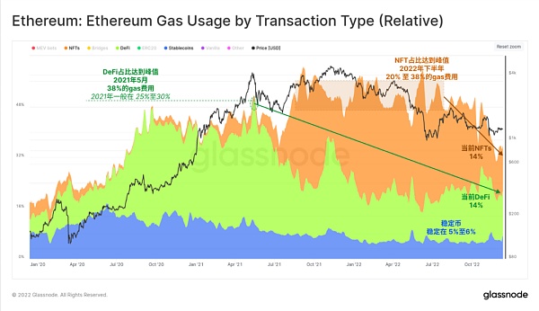 在類似的繁榮-蕭條周期中,NFT相關交易在2022年上半年占gas fee用量的20%至38%,但現在也下降到14%的占比。今年以來,穩定幣一直保持著5%至6%的占比。