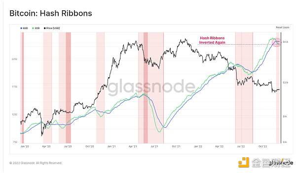 這導致算力帶再次反轉,交叉發生在 11 月下旬。 這表明挖礦業面臨著足夠大的壓力,一些運營商正在關閉 ASIC 礦機。 這通常與礦工收入流低于其 OPEX 支出有關,從而使 ASIC 礦機無利可圖。