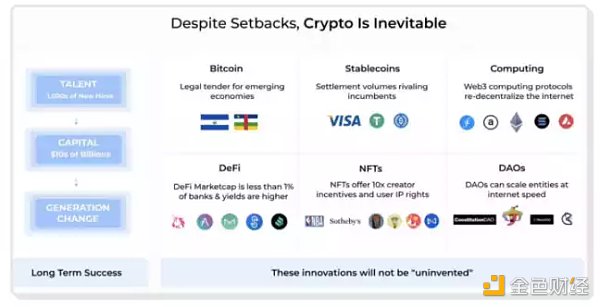 Selkis 指出,雖然「長期建設者可能暫時受到市場波動傷害,但他們并不是那些使欺詐永久化或欺騙投資者的人」。盡管該行業流動資金目前較少,但 Web3 仍在吸引世界上最聰明的人,他們利用越來越多的關鍵基礎設施來改變世界: