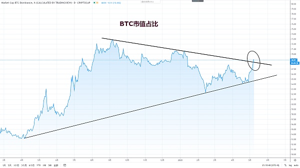 目前可以看出,BTC的市值占比已經突破下降趨勢線壓制,目前已漲至68%上方,近期整體走勢相當強勢,表現明顯強于其他主流幣以及山寨幣,BTC的吸血效應又在上演,由于目前BTC走勢強勢,資金必然會出現向BTC集中轉移,而這就會導致BTC價格進一步走強,推動BTC與其他幣漲幅的差異化更加明顯,再加上產量減半的共識,近期資金源源不斷的流向BTC,BTC上漲的同時,其他主流幣跟漲不明顯,也說明場內的資金缺乏,目前其他主流幣市值占比相對較低,對于BTC目前的價格來說處于低估狀態,所以后面不排除BTC產量減半落地后,場內資金開始流向其他主流幣,后面出現一個補漲的行情。