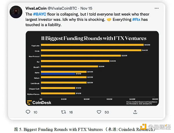 從公開的資料顯示,在 2022 年 3 月份時FTX曾參與了YugaLabs的種子輪融資。該輪融資YugaLabs的估計是 40 億美元,融資總金額是 4.5 億,由a 16 z 領投,FTX、Animoca Brands 等參投。因此我們看到本輪融資是由a 16 z領投,FTX為參投。