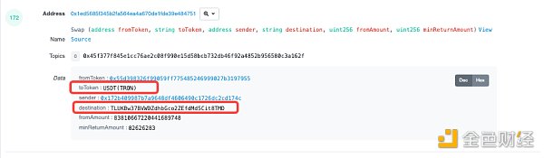 攻擊者在0x89e692c1b31e7f03b7b9cbb1c7ab7872ddeadd49地址上進行了資金的跨鏈轉移,在txhash為0x72905bd839f682f795946d285500143ee7606e9690df2ad32968e878ad290d9f的交易中,如下圖所示,將10561 USDT通過Transit.Finance的合約(0xb45a2dda996c32e93b8c47098e90ed0e7ab18e39)進行了Cross操作。在這筆交易的Event Logs中,可以看到資金去向了TRON鏈的USDT,對應地址是TLUKBw37BVWDZdhbGco2ZEfdMd5Cit8TMD,對應TRON鏈上的交易hash是:716507136ad28717ffd5f2f437af753ff96d344d2bcbe83f24d801db49f5a884