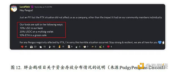 而其他項目則影響相對較小。并且有部分NFT項目已經在陸續發表文件,表明自己在FTX上并沒有頭寸。其中最為突出的是 Pudgy Penguins,他們甚至提供了有關其資金分配方式的詳細信息。即 70% 的資金放在銀行, 20% 在多簽錢包,剩余 10% 在gnosis錢包。